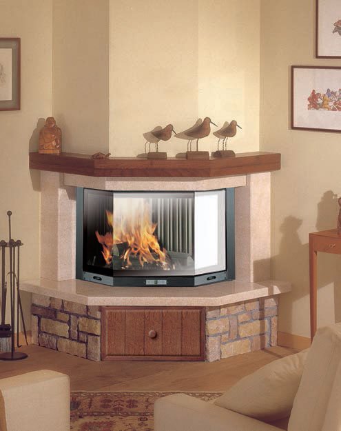 Угловая модель, плита и обрамление колошника которой выполнены из полированного мрамора трани, цоколь из колотого мрамора вичентино, стальной ящик для дров обшит деревом. Балка из затемненного массива дуба.