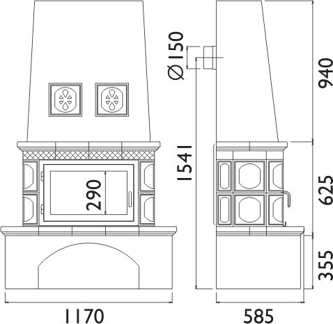 - Диаметр дымохода, (мм) 150